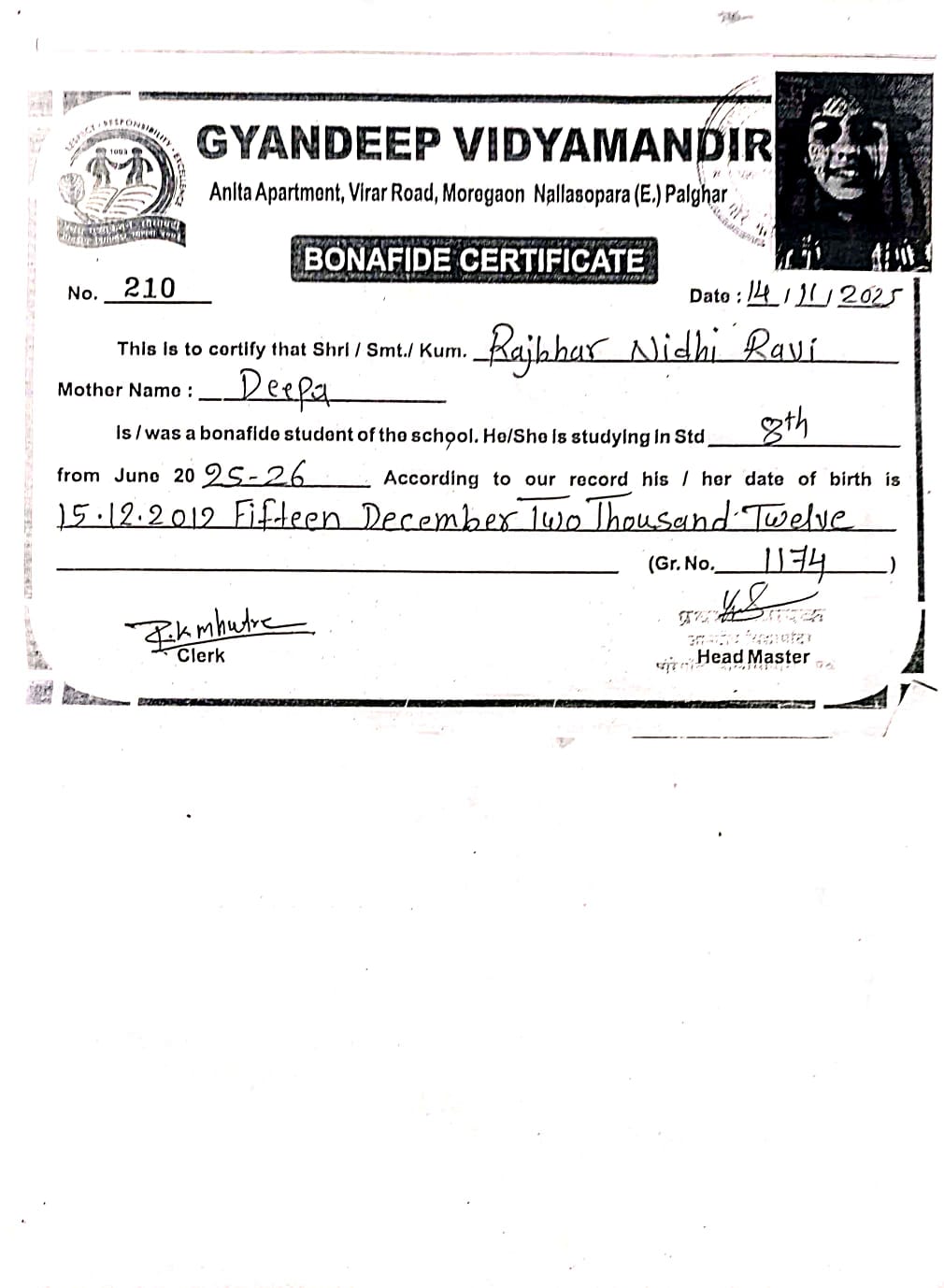 Miss Nidhi Ravi Rajbhar is currently studying at Gyan Education Trusts (Gnandeep Vidhya mandir) 6th Standard, Nallasopara, Maharashtra.