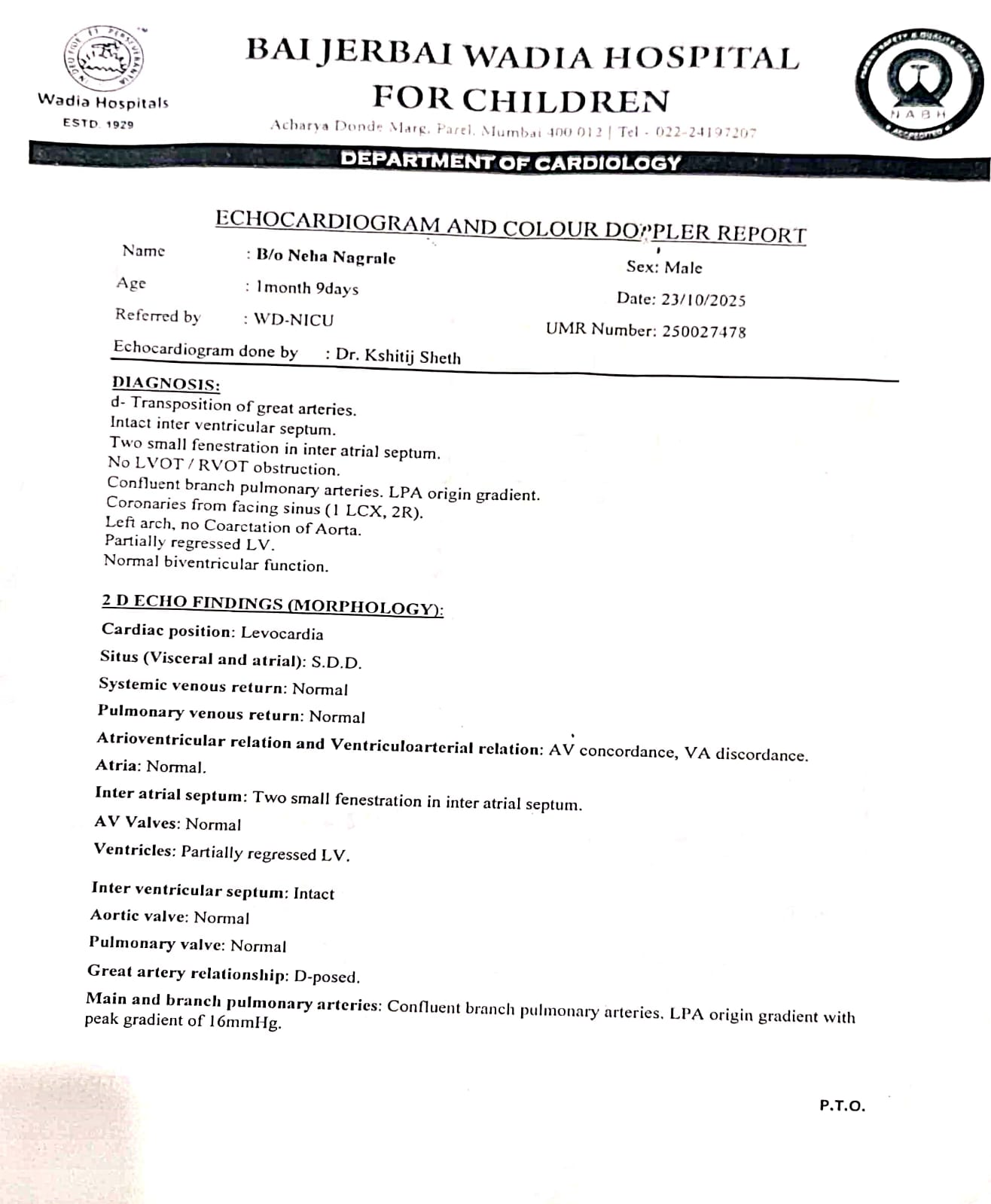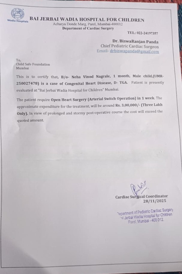 Baby boy B/o Neha Vinod Nagrale, just 1 month old, has been diagnosed with a serious Congenital Heart Disease – D-TGA. Doctors at Bai Jerbai Wadia Hospital for Children, Mumbai, have advised an Open Heart Surgery (Arterial Switch Operation) within 1 week.