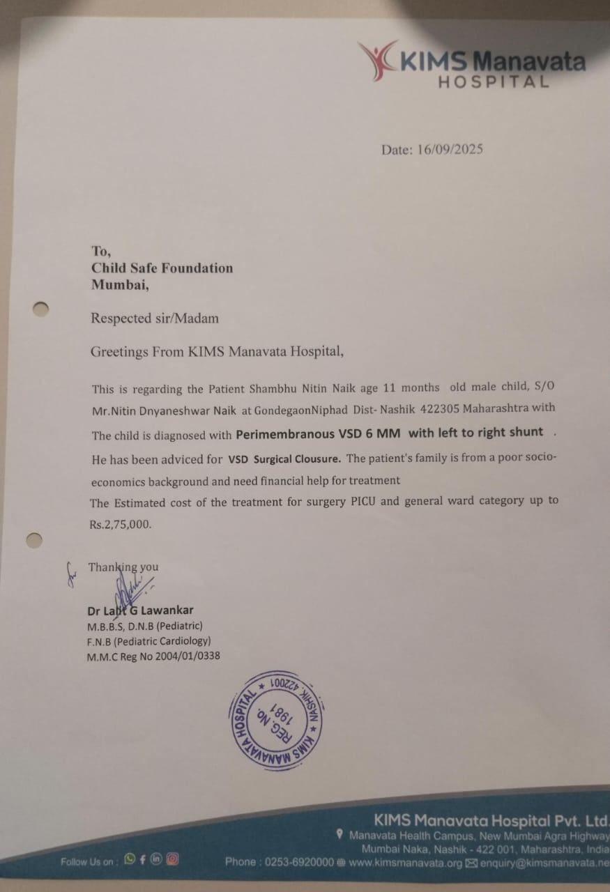 Doctors at KIMS Manavata Hospital, Nashik have advised urgent VSD Surgical Closure to save his life. The estimated cost of surgery, PICU care, and hospitalization is Rs 2,75,000, an amount far beyond the reach of his family.