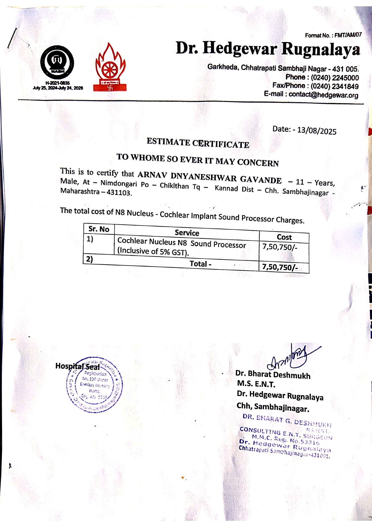 Arnav Dnyaneshwar Gavande, an 11-year-old boy from Chhatrapati Sambhajinagar, has been diagnosed with severe hearing loss in both ears. According to his audiology report, he urgently requires a Cochlear Nucleus N8 Sound Processor, which is essential for him to hear, speak confidently, and continue his education without limitations.
